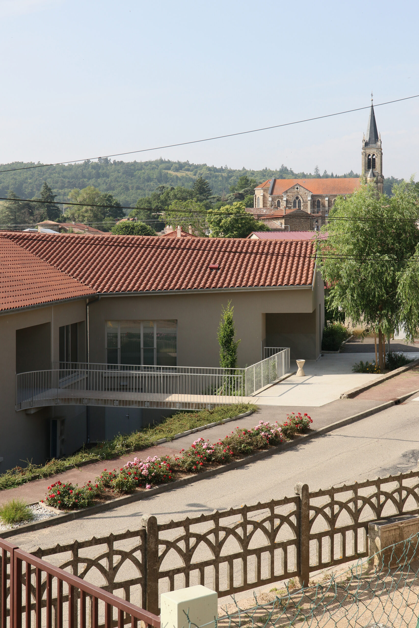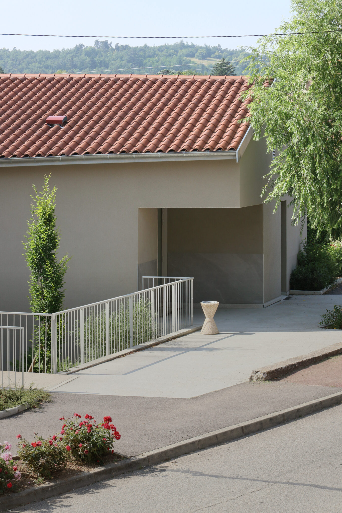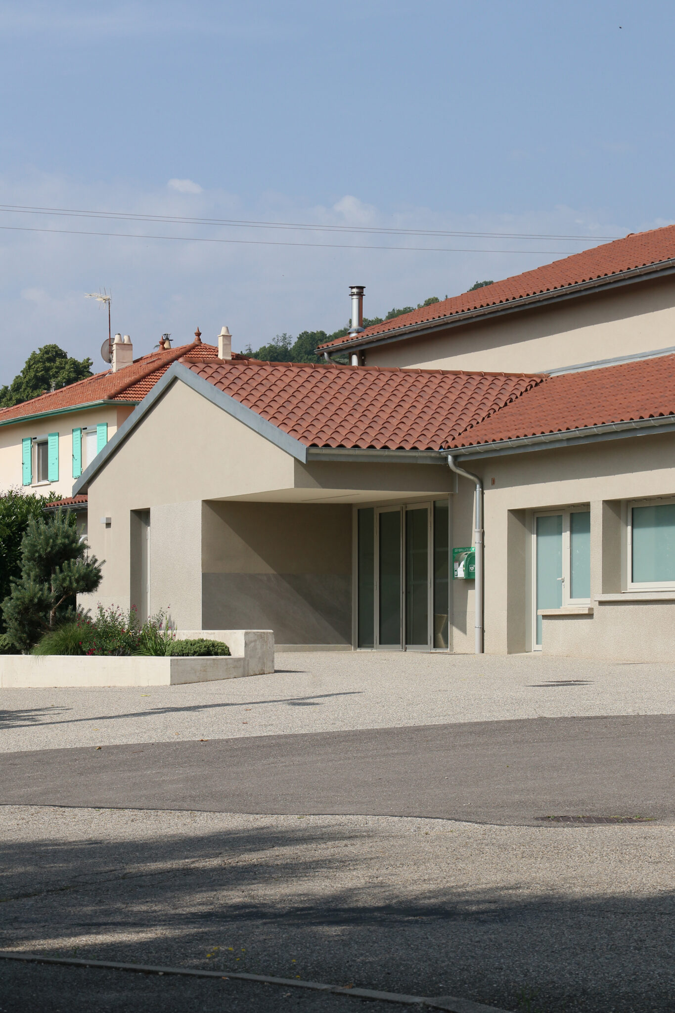 À la structure des années 70 entièrement réhabilitée, nous avons adjoint trois extensions répondant aux nouvelles normes de confort thermique et d’accessibilité dans un nouvel ensemble aux formes continues. Située dans la continuité du corps de bâtiment existant, la première abrite un nouvel office ainsi qu’une salle multi-activités et une salle des aînés ; elle dote l’équipement d’une nouvelle proue largement ouverte sur son environnement. La deuxième, implantée dans la pente, accueille au niveau bas un vaste espace de stockage au service de la salle des fêtes et, à l’étage, des salles pour les jeunes de la commune accessibles de plain-pied depuis la rue. La troisième, enfin, abrite de nouveaux sanitaires et marque l’entrée en introduisant un appel dans la linéarité de la façade principale.