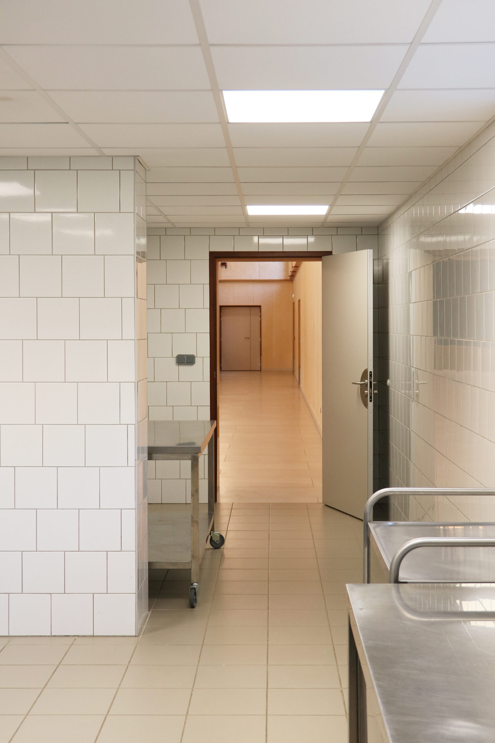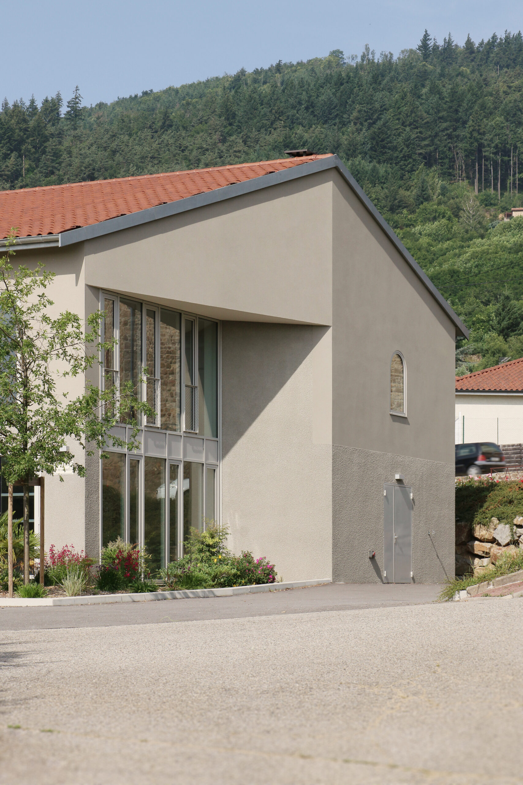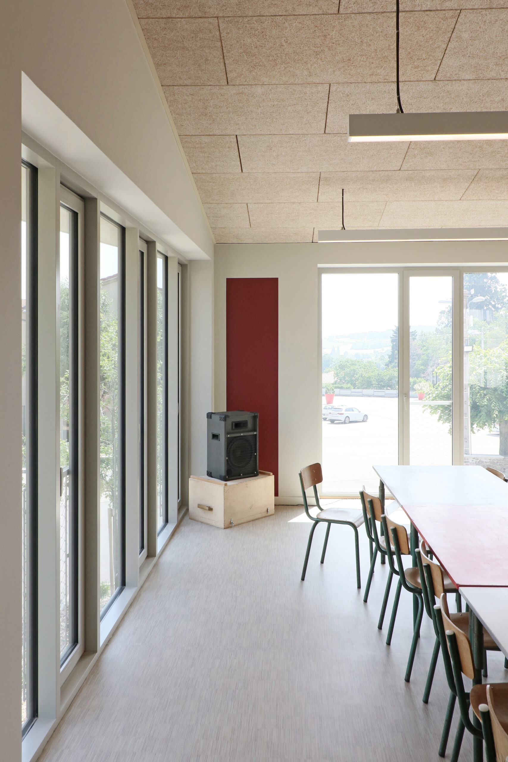 À la structure des années 70 entièrement réhabilitée, nous avons adjoint trois extensions répondant aux nouvelles normes de confort thermique et d’accessibilité dans un nouvel ensemble aux formes continues. Située dans la continuité du corps de bâtiment existant, la première abrite un nouvel office ainsi qu’une salle multi-activités et une salle des aînés ; elle dote l’équipement d’une nouvelle proue largement ouverte sur son environnement. La deuxième, implantée dans la pente, accueille au niveau bas un vaste espace de stockage au service de la salle des fêtes et, à l’étage, des salles pour les jeunes de la commune accessibles de plain-pied depuis la rue. La troisième, enfin, abrite de nouveaux sanitaires et marque l’entrée en introduisant un appel dans la linéarité de la façade principale.