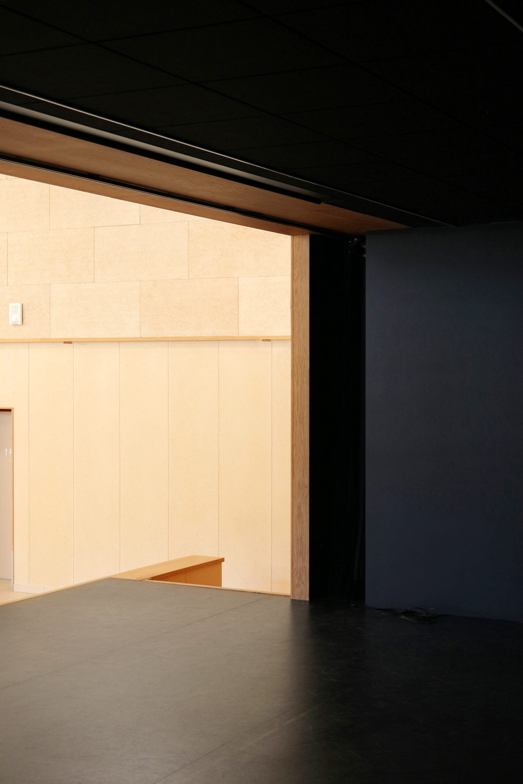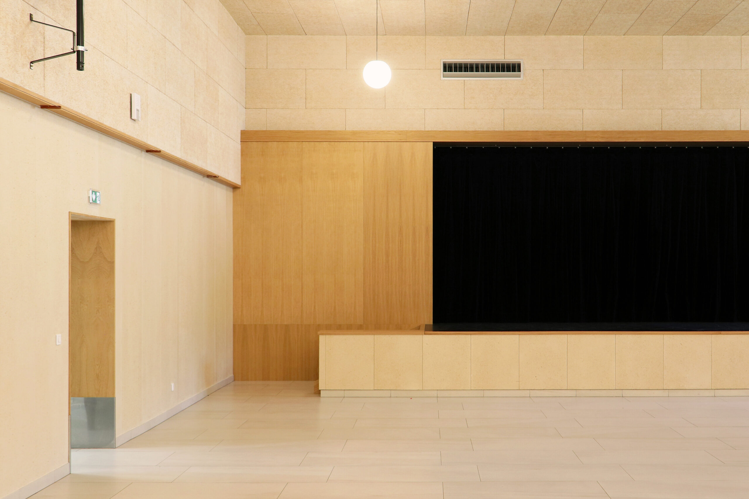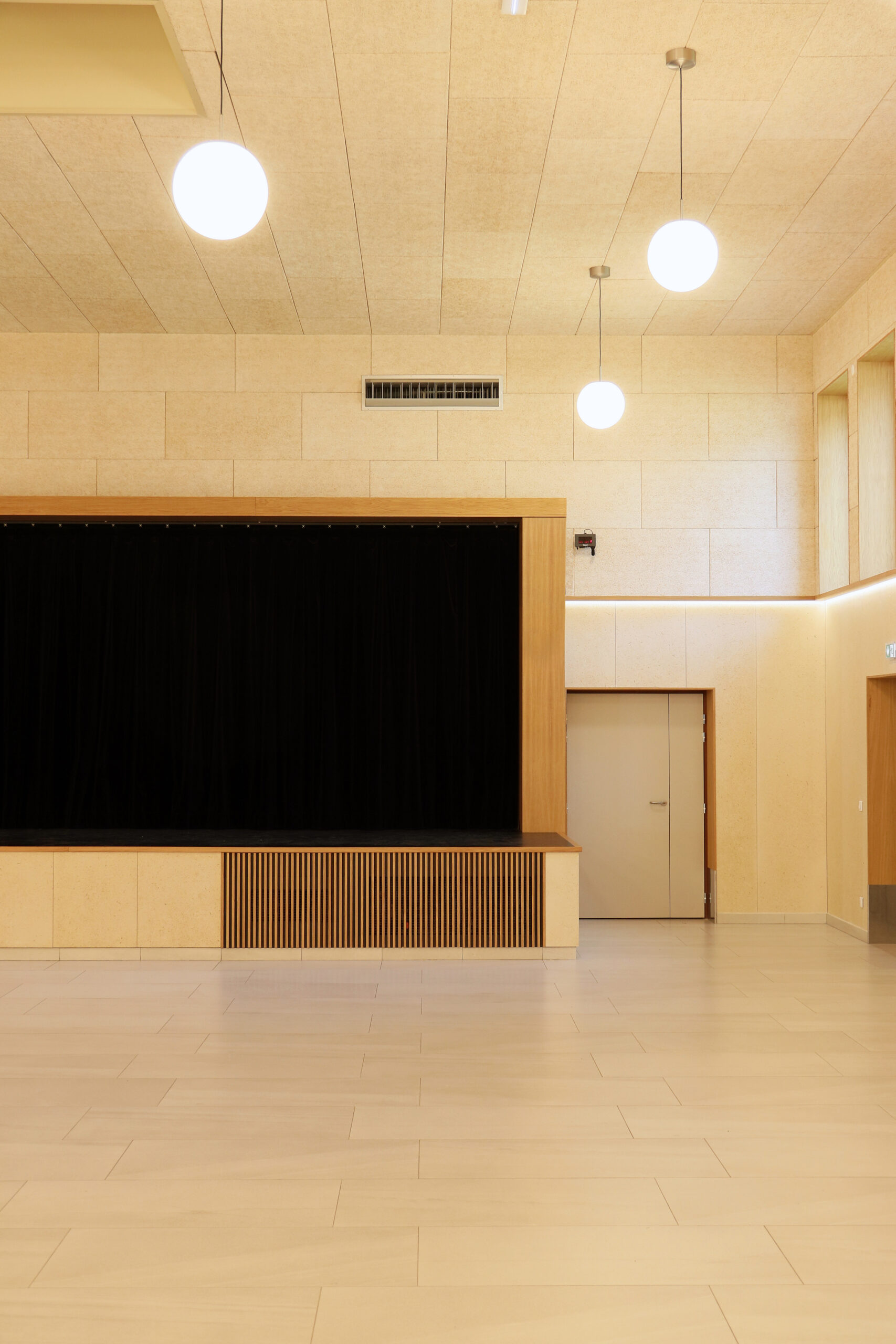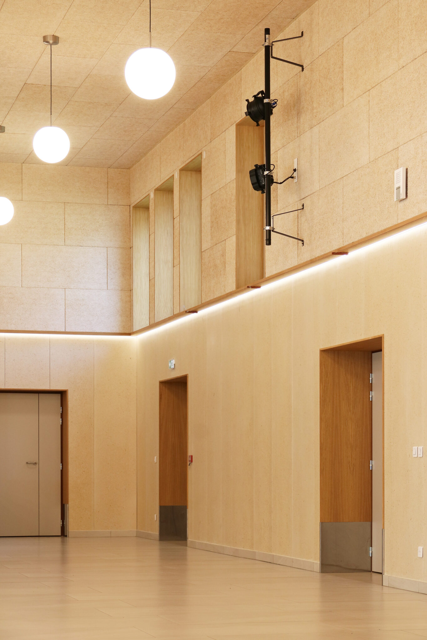 À l’intérieur, tout en conservant la volumétrie initiale, nous avons habillé la salle principale d’une peau de bois dont les textures varient selon les besoins de chaque paroi. Nous avons ainsi sélectionné un haut soubassement en panneaux bois-ciment pour sa résistance aux chocs, tandis que des panneaux de chêne viennent souligner la scène et les embrasures. En partie haute et en plafond, l’usage de plaques en fibres de bois assure un excellent confort acoustique. La réunion de ces finitions définit une ambiance chromatique enveloppante et chaleureuse, adaptée aux exigences de pérennité d’un usage intensif.