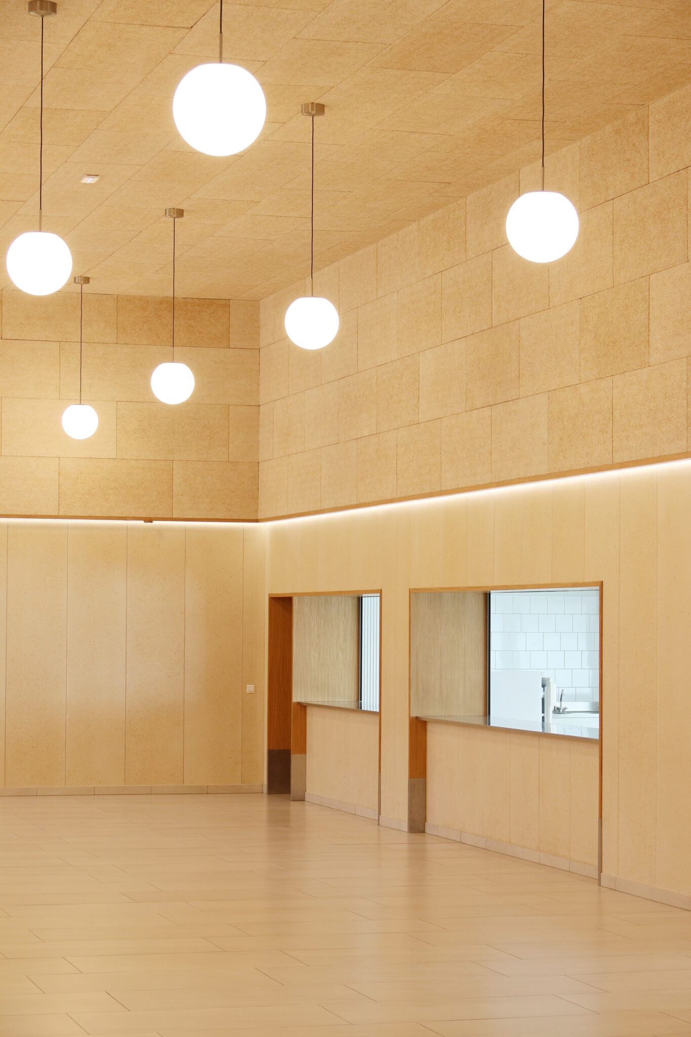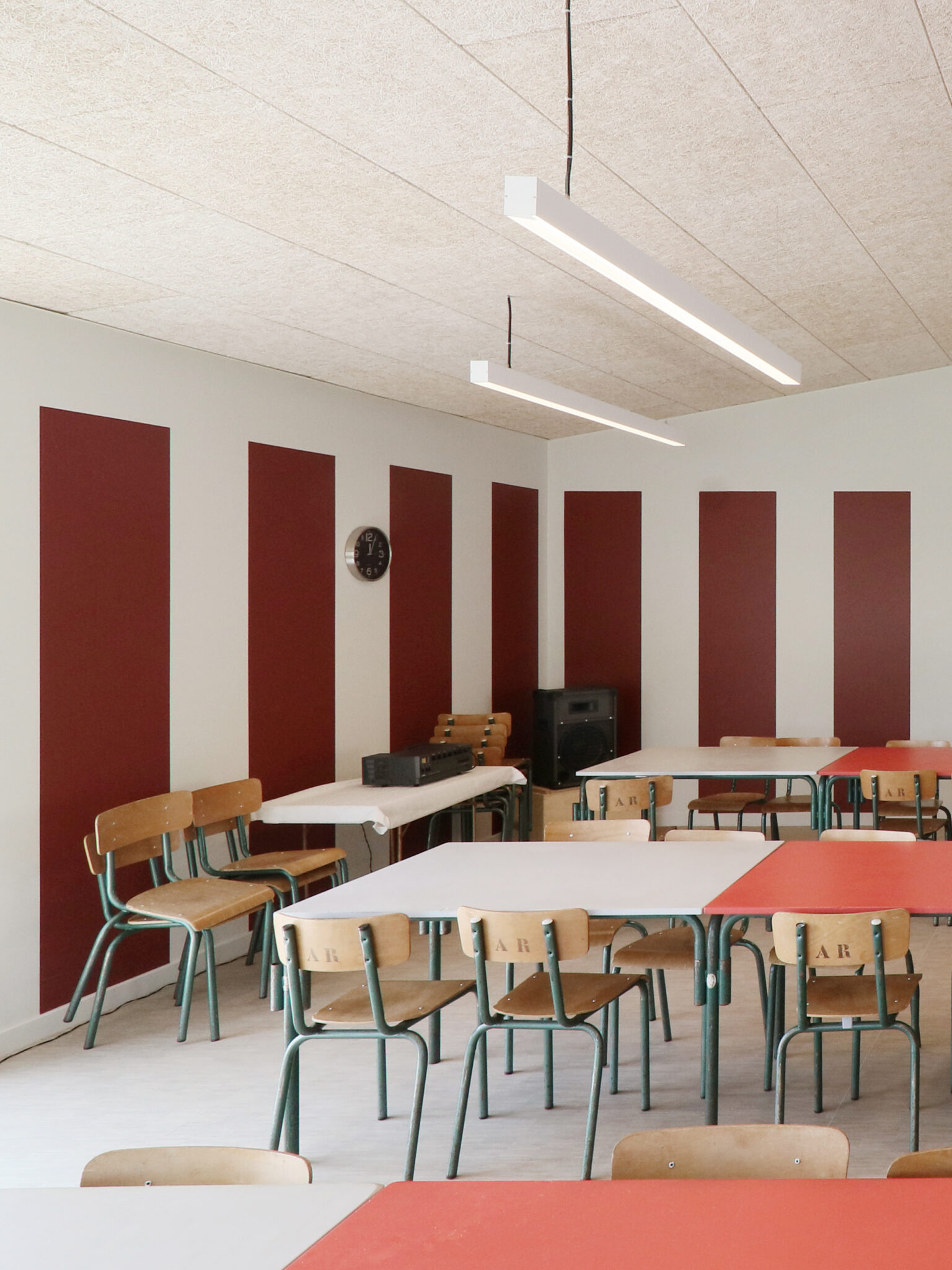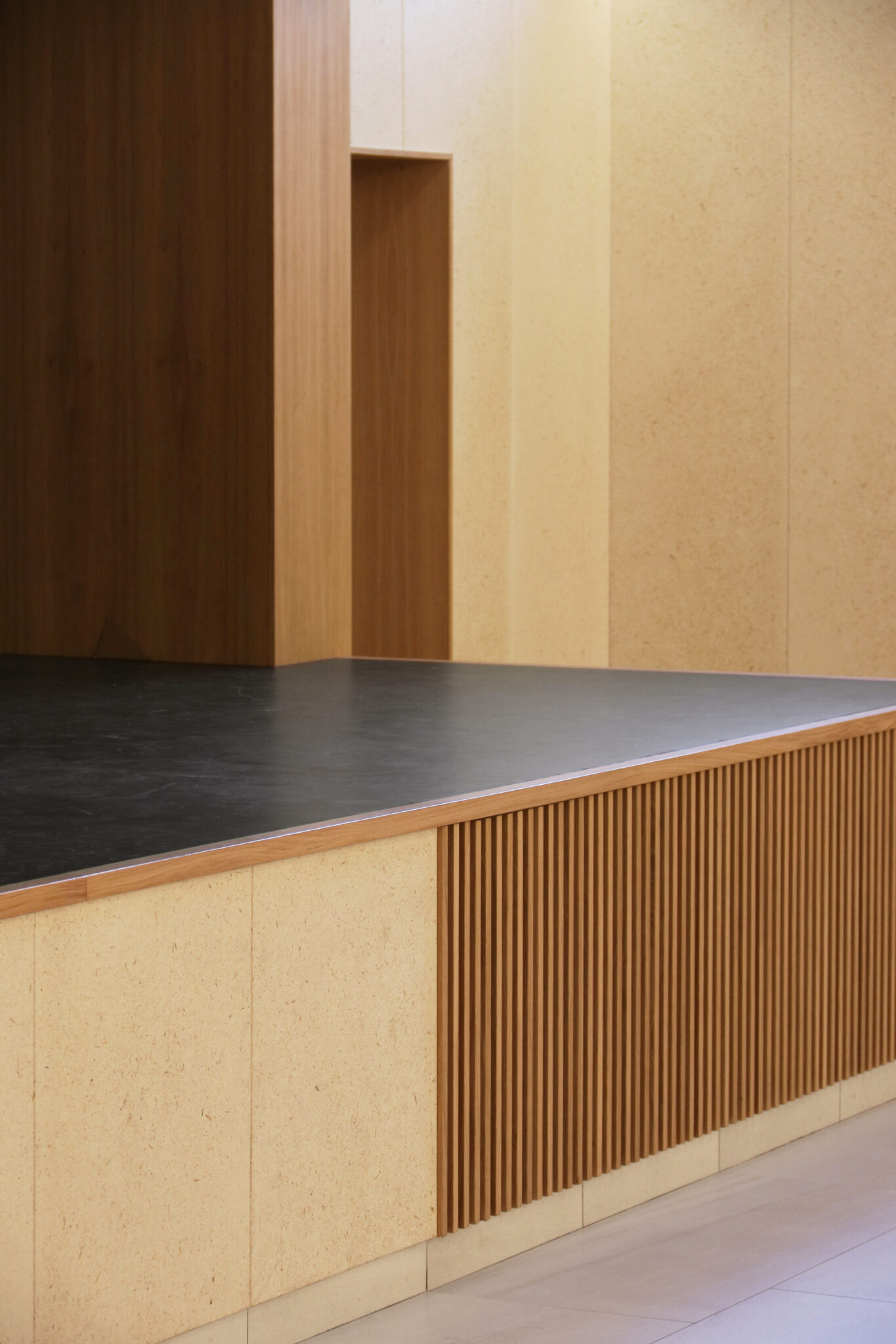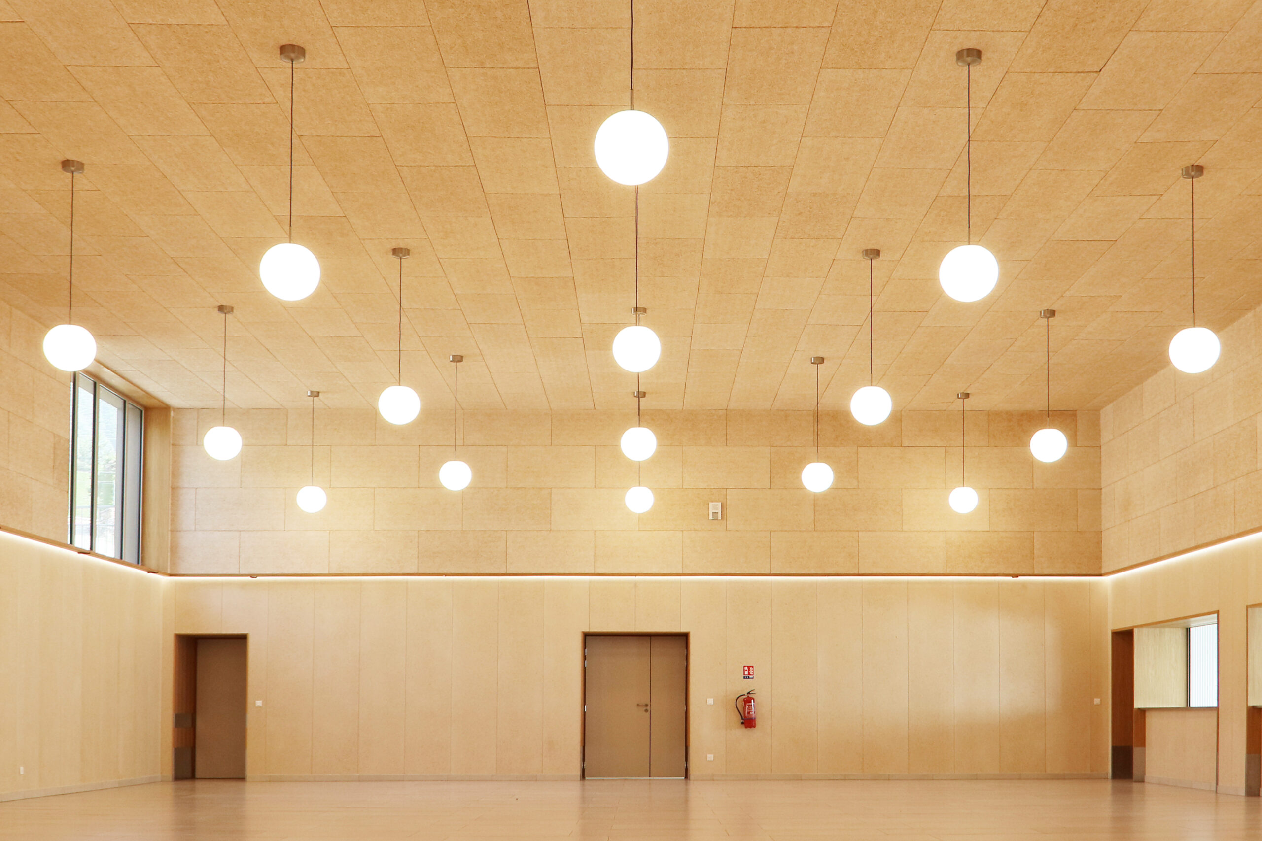 À l’intérieur, tout en conservant la volumétrie initiale, nous avons habillé la salle principale d’une peau de bois dont les textures varient selon les besoins de chaque paroi. Nous avons ainsi sélectionné un haut soubassement en panneaux bois-ciment pour sa résistance aux chocs, tandis que des panneaux de chêne viennent souligner la scène et les embrasures. En partie haute et en plafond, l’usage de plaques en fibres de bois assure un excellent confort acoustique. La réunion de ces finitions définit une ambiance chromatique enveloppante et chaleureuse, adaptée aux exigences de pérennité d’un usage intensif.