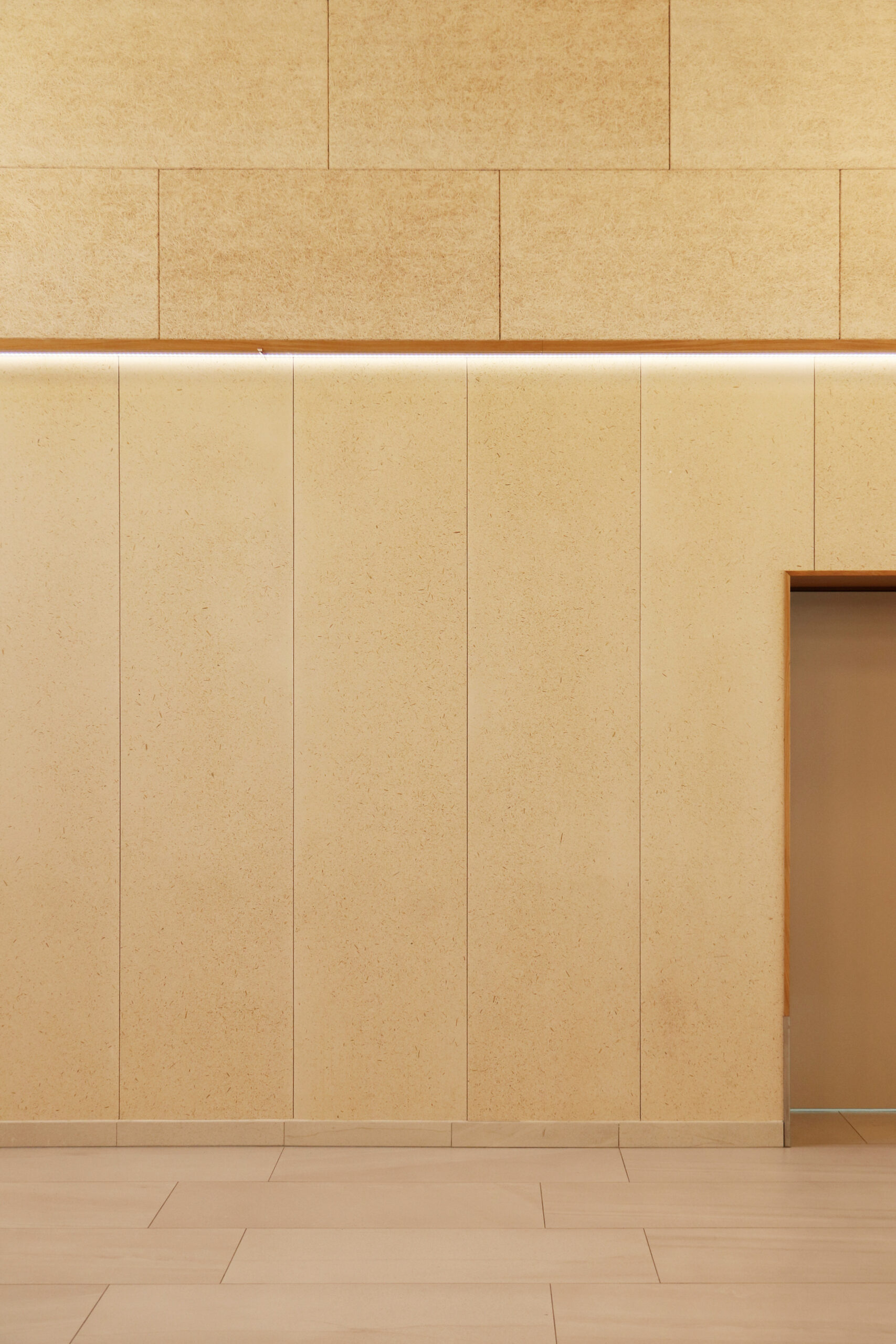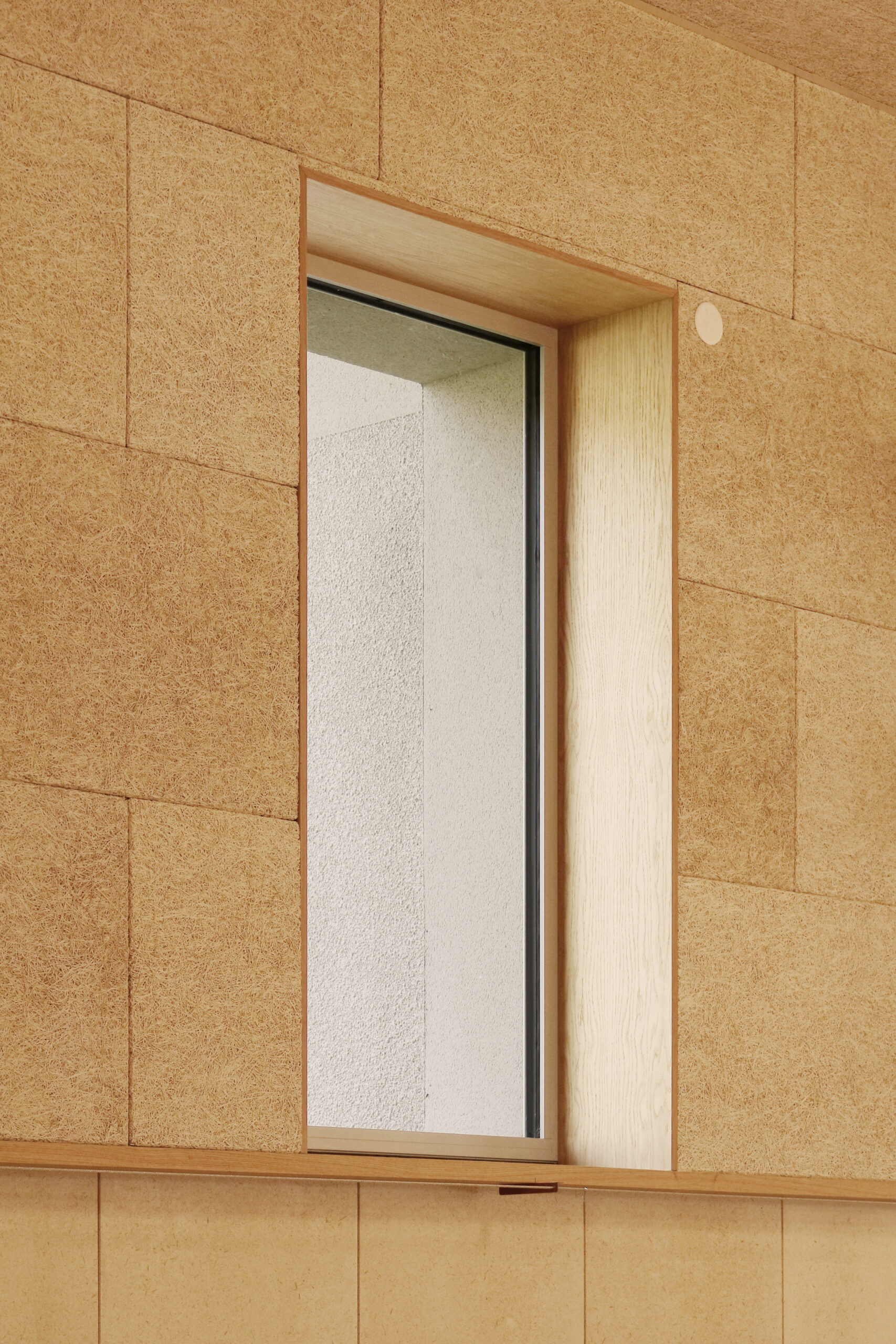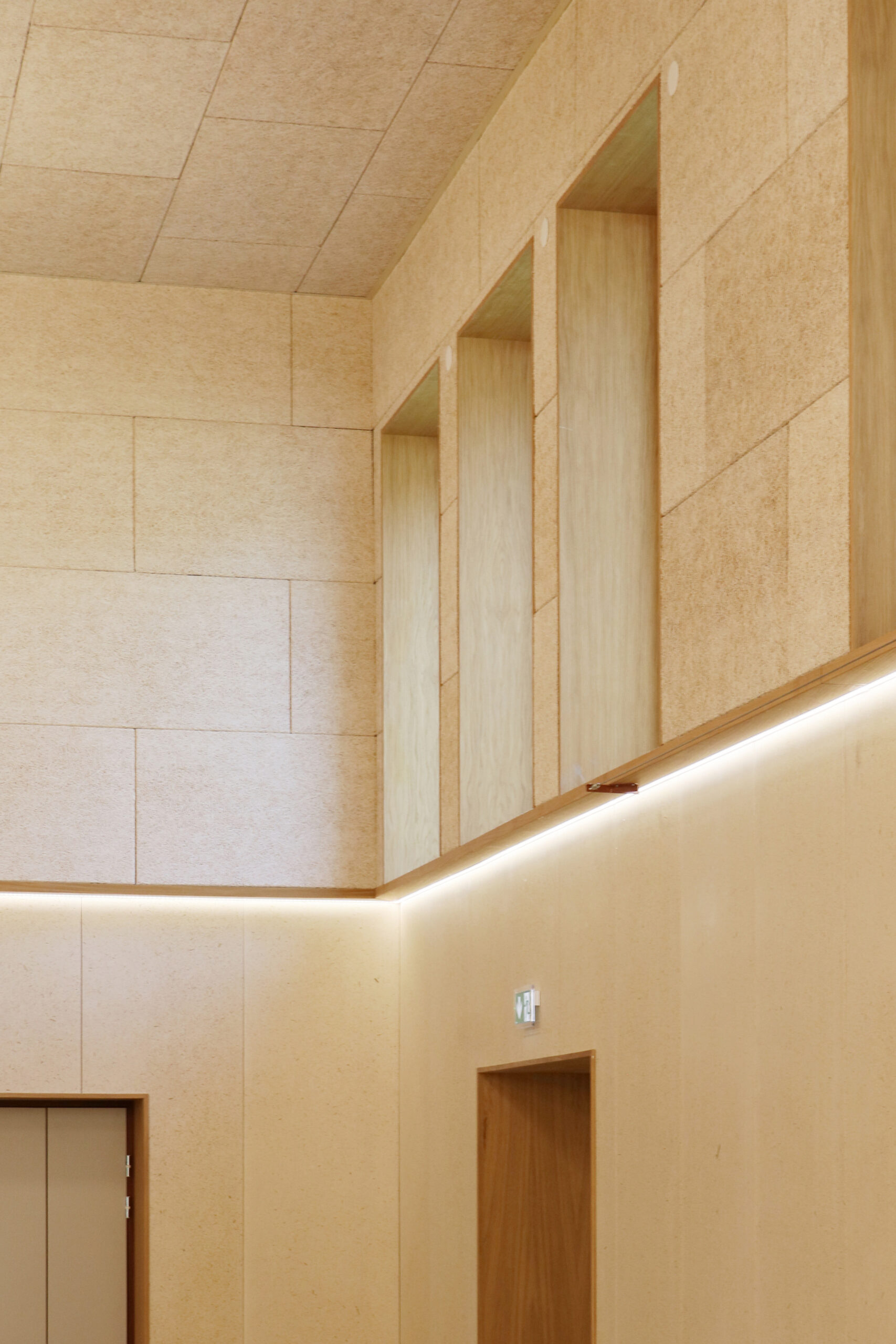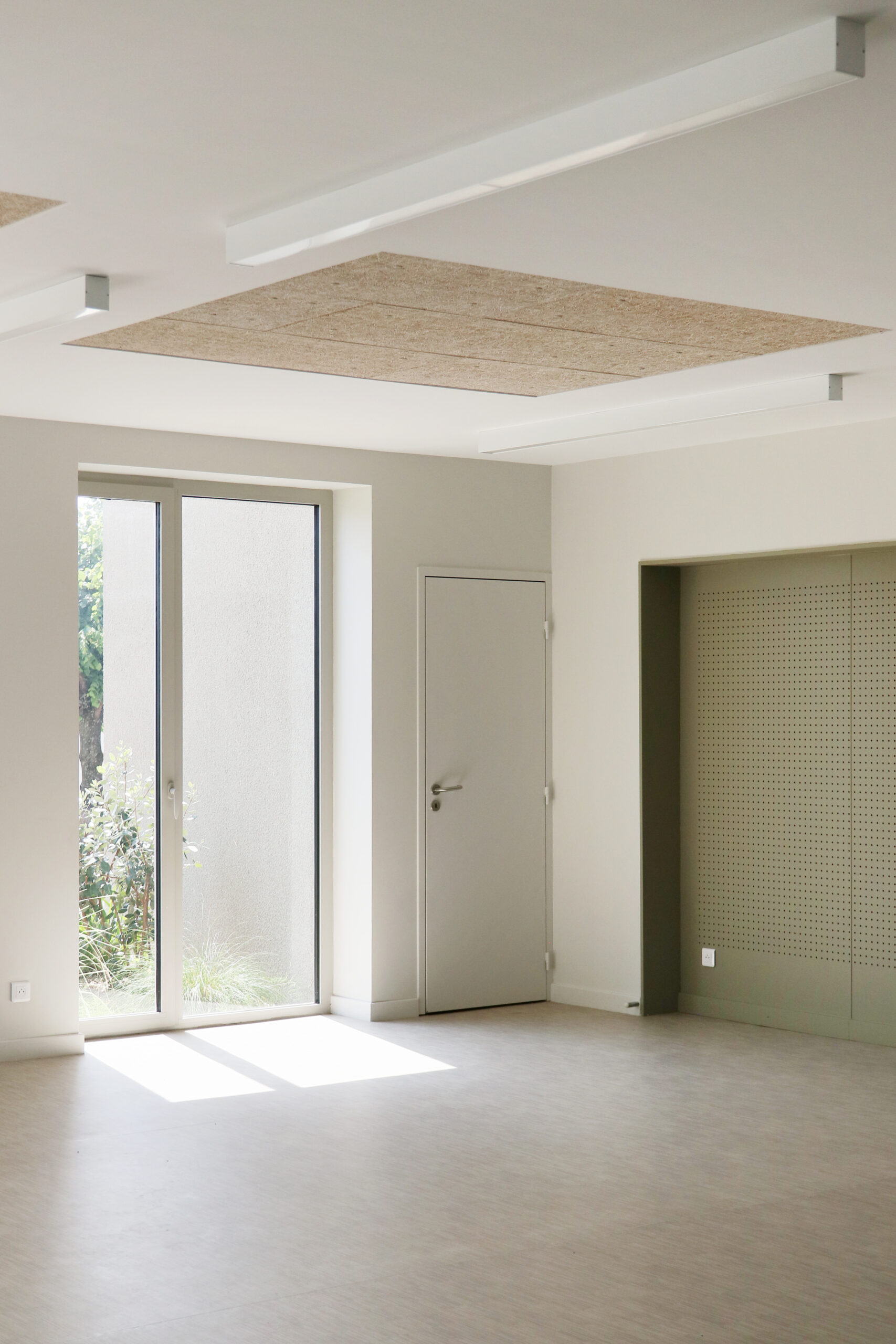 À l’intérieur, tout en conservant la volumétrie initiale, nous avons habillé la salle principale d’une peau de bois dont les textures varient selon les besoins de chaque paroi. Nous avons ainsi sélectionné un haut soubassement en panneaux bois-ciment pour sa résistance aux chocs, tandis que des panneaux de chêne viennent souligner la scène et les embrasures. En partie haute et en plafond, l’usage de plaques en fibres de bois assure un excellent confort acoustique. La réunion de ces finitions définit une ambiance chromatique enveloppante et chaleureuse, adaptée aux exigences de pérennité d’un usage intensif.