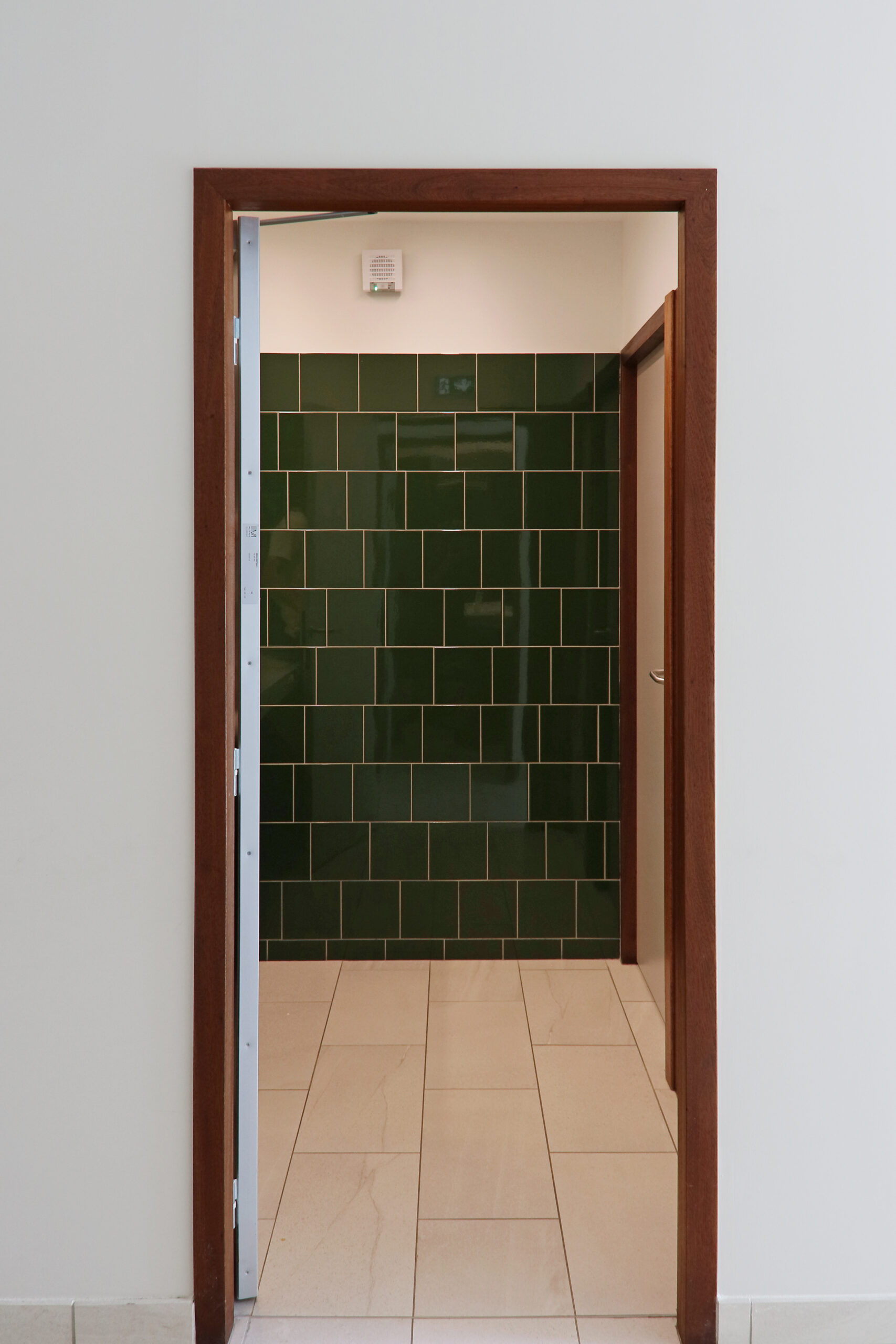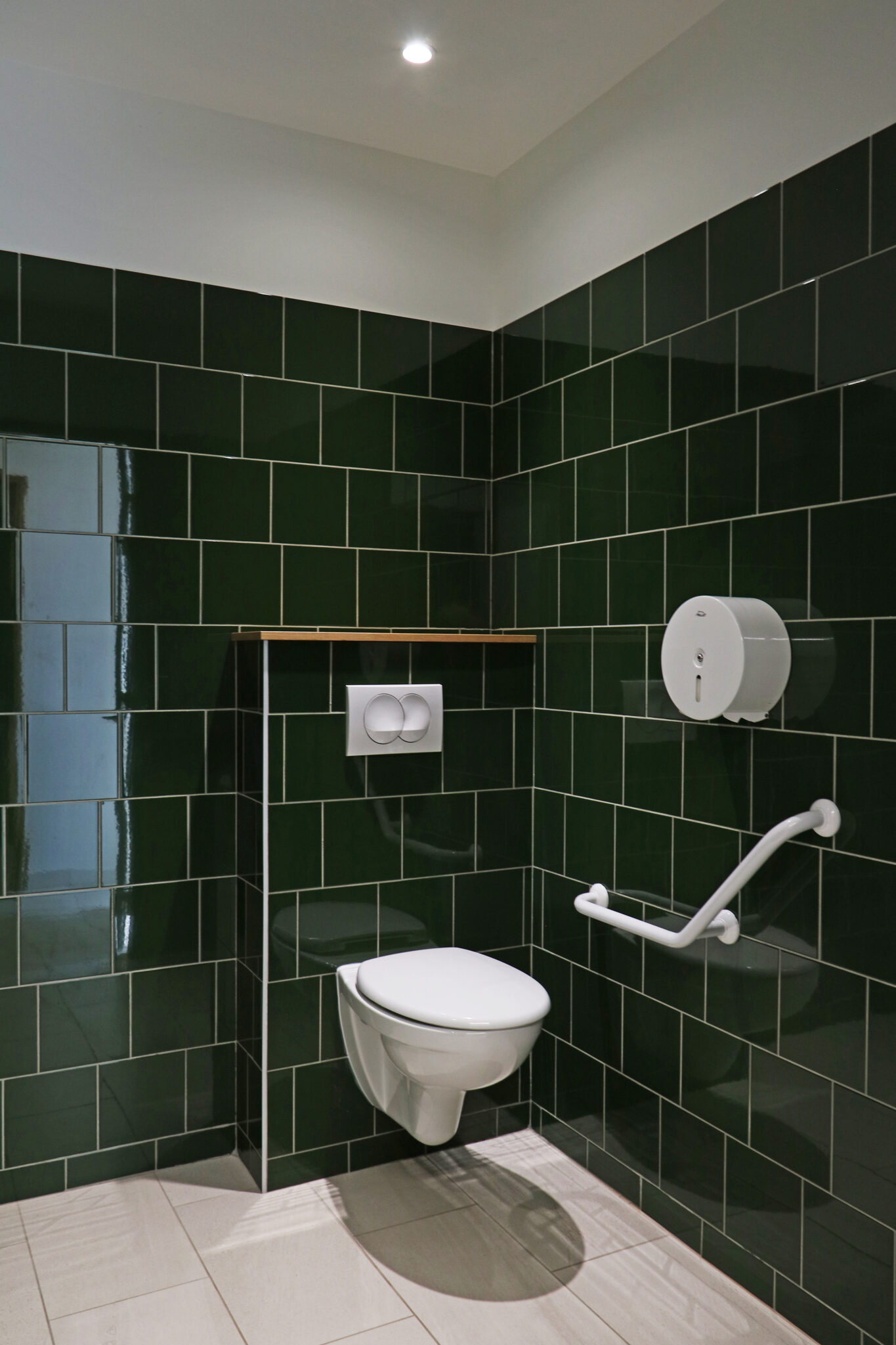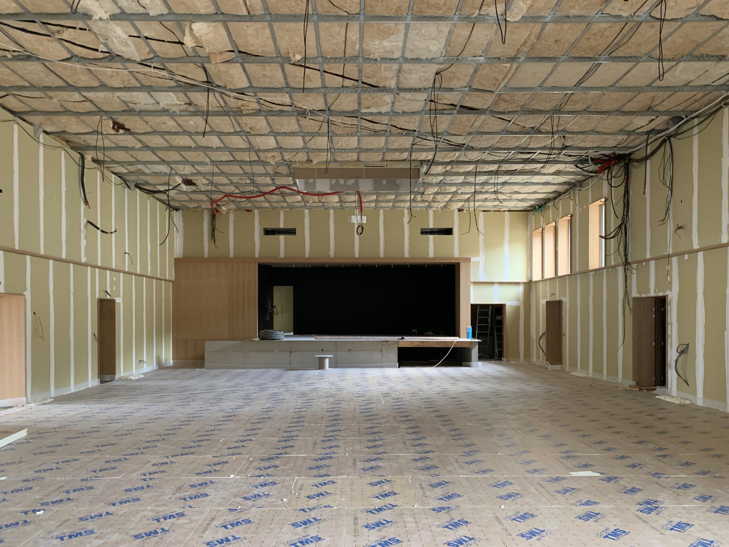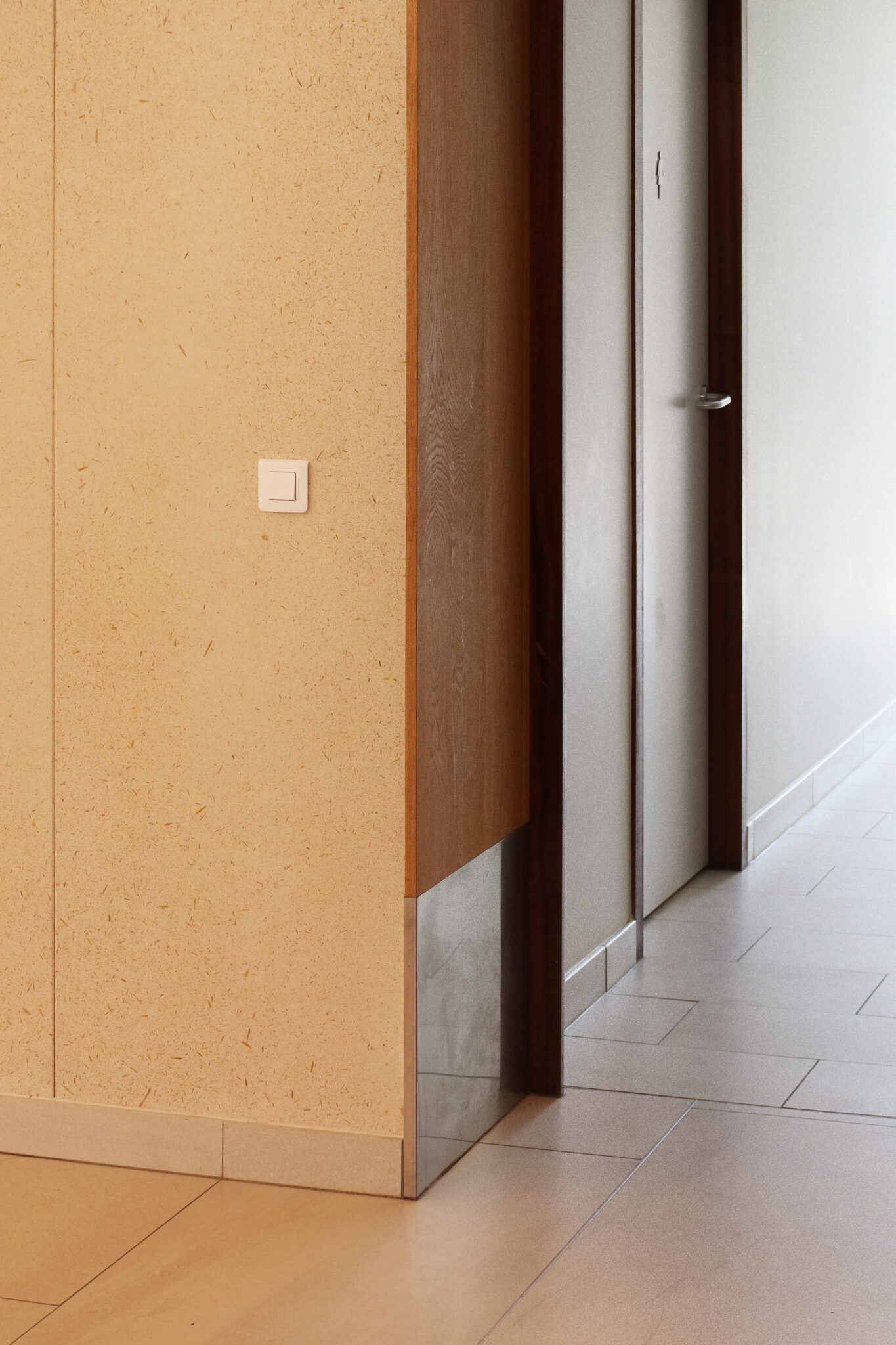 À l’intérieur, tout en conservant la volumétrie initiale, nous avons habillé la salle principale d’une peau de bois dont les textures varient selon les besoins de chaque paroi. Nous avons ainsi sélectionné un haut soubassement en panneaux bois-ciment pour sa résistance aux chocs, tandis que des panneaux de chêne viennent souligner la scène et les embrasures. En partie haute et en plafond, l’usage de plaques en fibres de bois assure un excellent confort acoustique. La réunion de ces finitions définit une ambiance chromatique enveloppante et chaleureuse, adaptée aux exigences de pérennité d’un usage intensif.